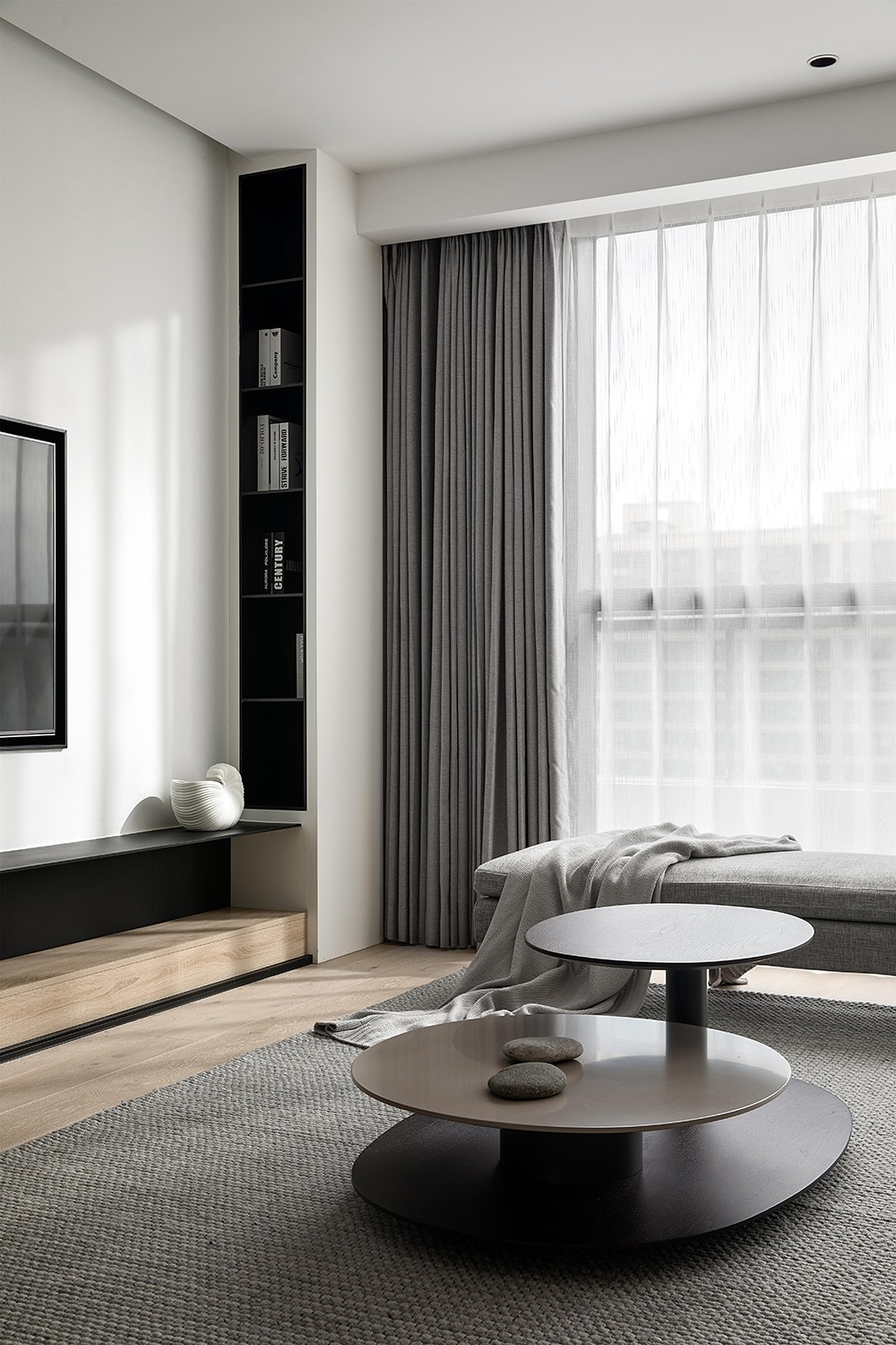 以灰色亚麻地毯、质感布艺沙发及深灰窗帘为主色调