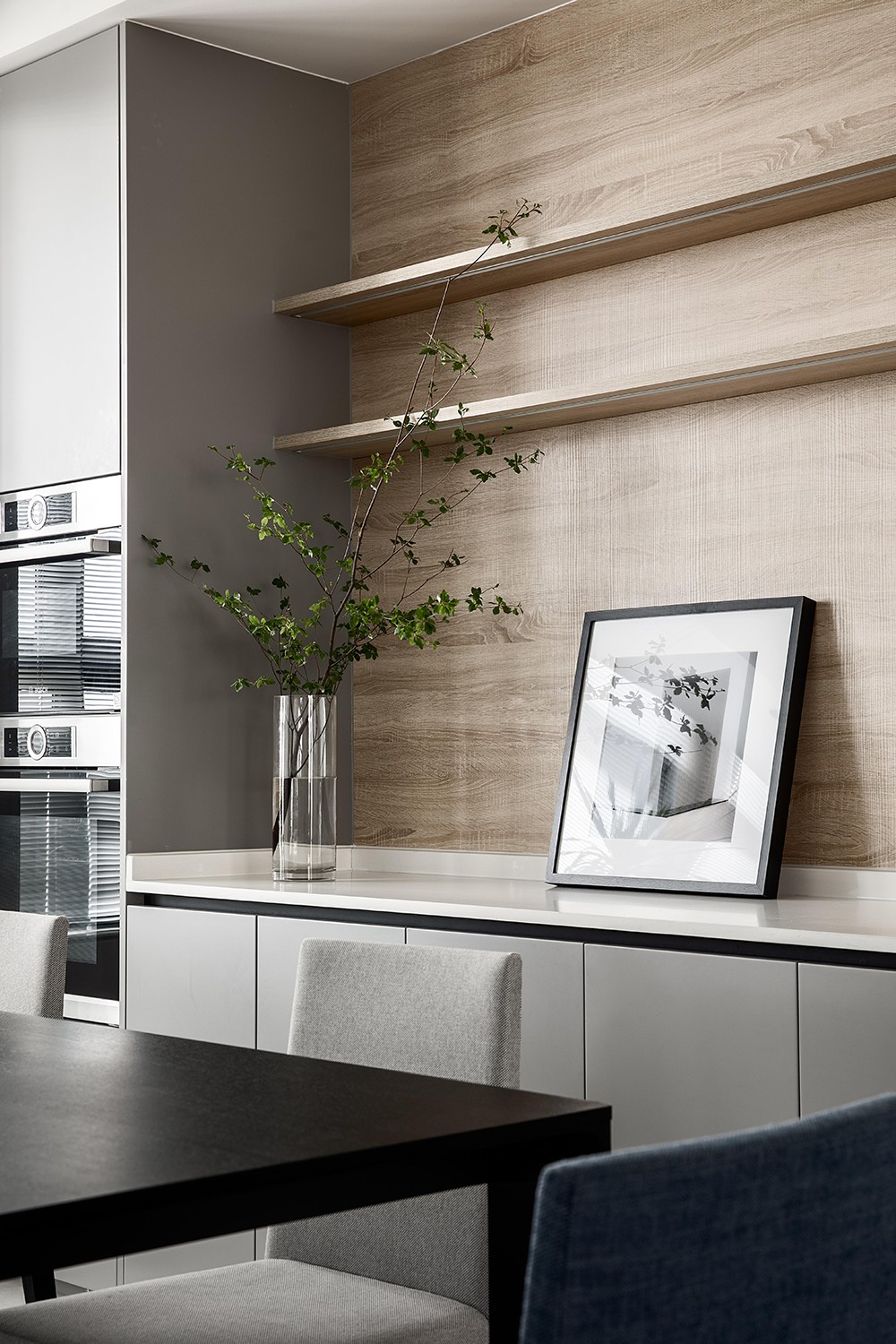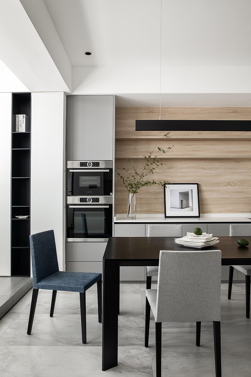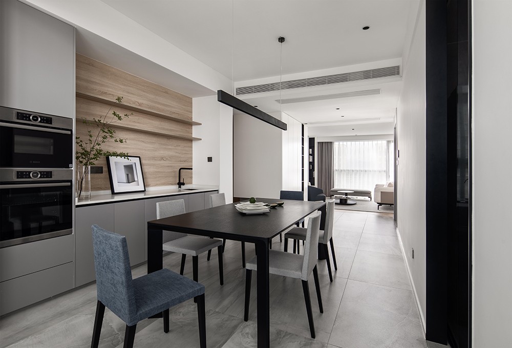 点缀着蓝灰、浅灰的餐椅
