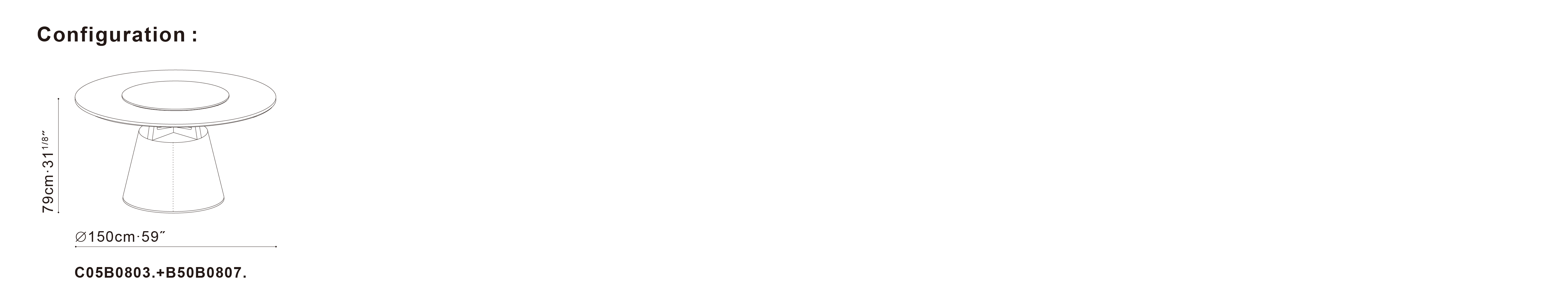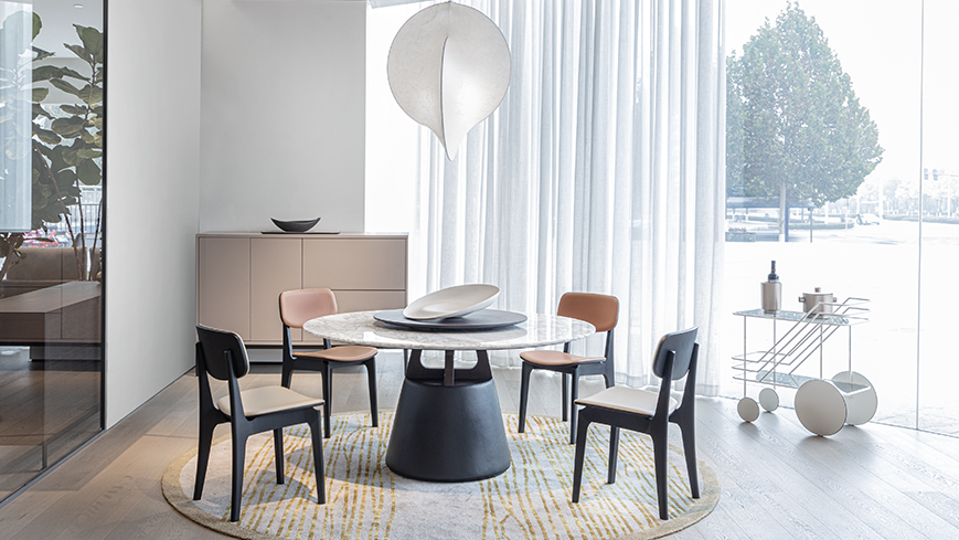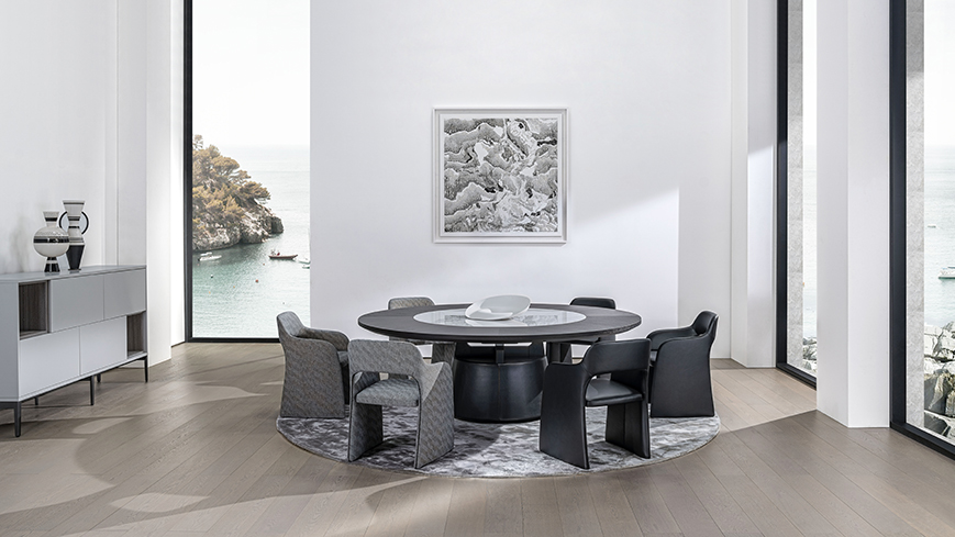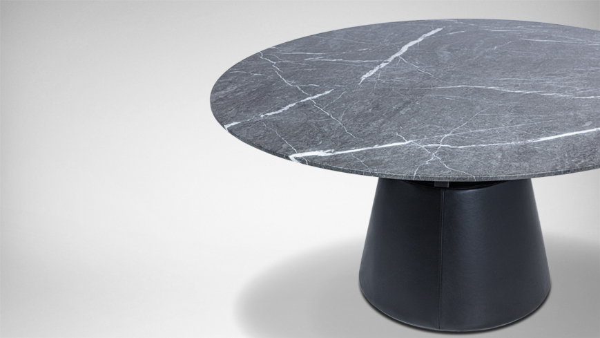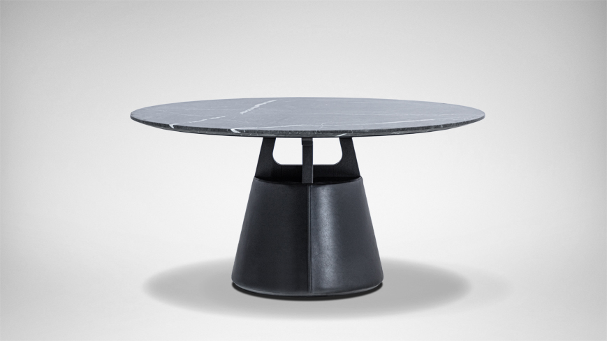 圆形的桌面,圆锥体的桌腿,简约现代。中间的小圆形桌面可自由转动,满足众人就餐的需要。